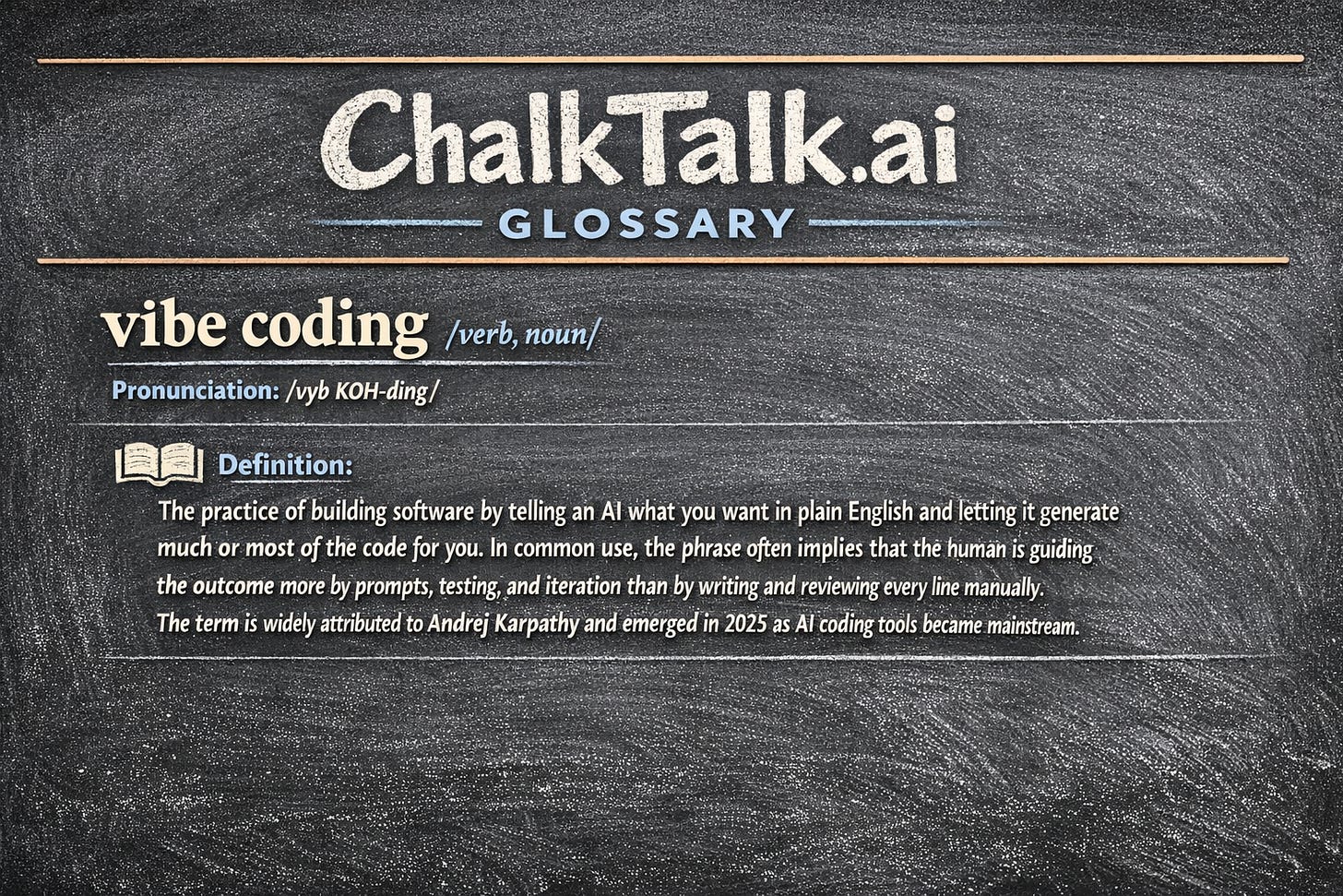 The practice of building software by telling an AI what you want in plain English and letting it generate much or most of the code for you. In common use, the phrase often implies that the human is guiding the outcome more by prompts, testing, and iteration than by writing and reviewing every line manually. The term is widely attributed to Andrej Karpathy and emerged in 2025 as AI coding tools became mainstream.